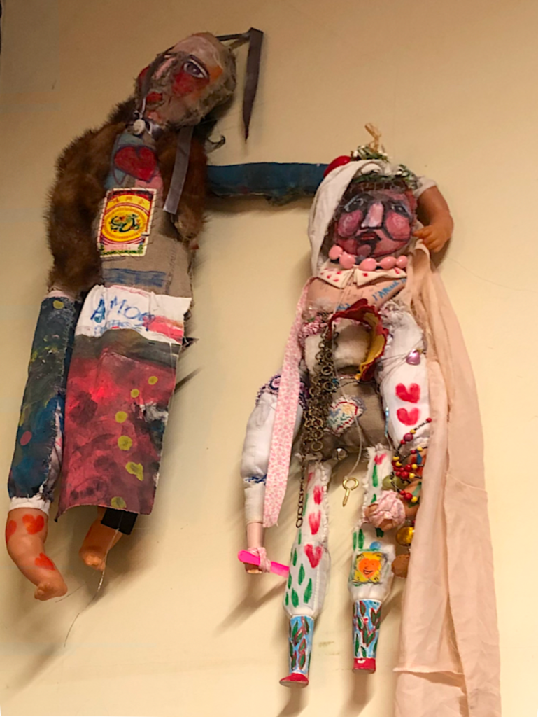 ma première création c’était à 6 ans à l’école parce que j’étais dyslexique et une maîtresse a bien aimé, elle a trouvé ça joli, donc après j’ai beaucoup dessiné, mais à 28 ans j’ai montré mes dessins et on m’a dit qu’ils étaient moches donc là j’ai fait des poupées, des poupées de toute ma famille parce que je voulais pas qu’ils meurent et tout ça, les poupées j’en fais encore mais elles sont différentes des premières poupées, les premières poupées c’était vraiment pour les membres de ma famille, il y avait un organe par personne, et après c’était des poupées plus pour trouver l’amoureux, après quand j’avais un amoureux c’était pour pas le perdre, mais je l ‘ai toujours perdu, donc souvent il y a des vrais cheveux, il y a des mots et maintenant il y a plus des poupées pour rencontrer l’amour, à nouveau