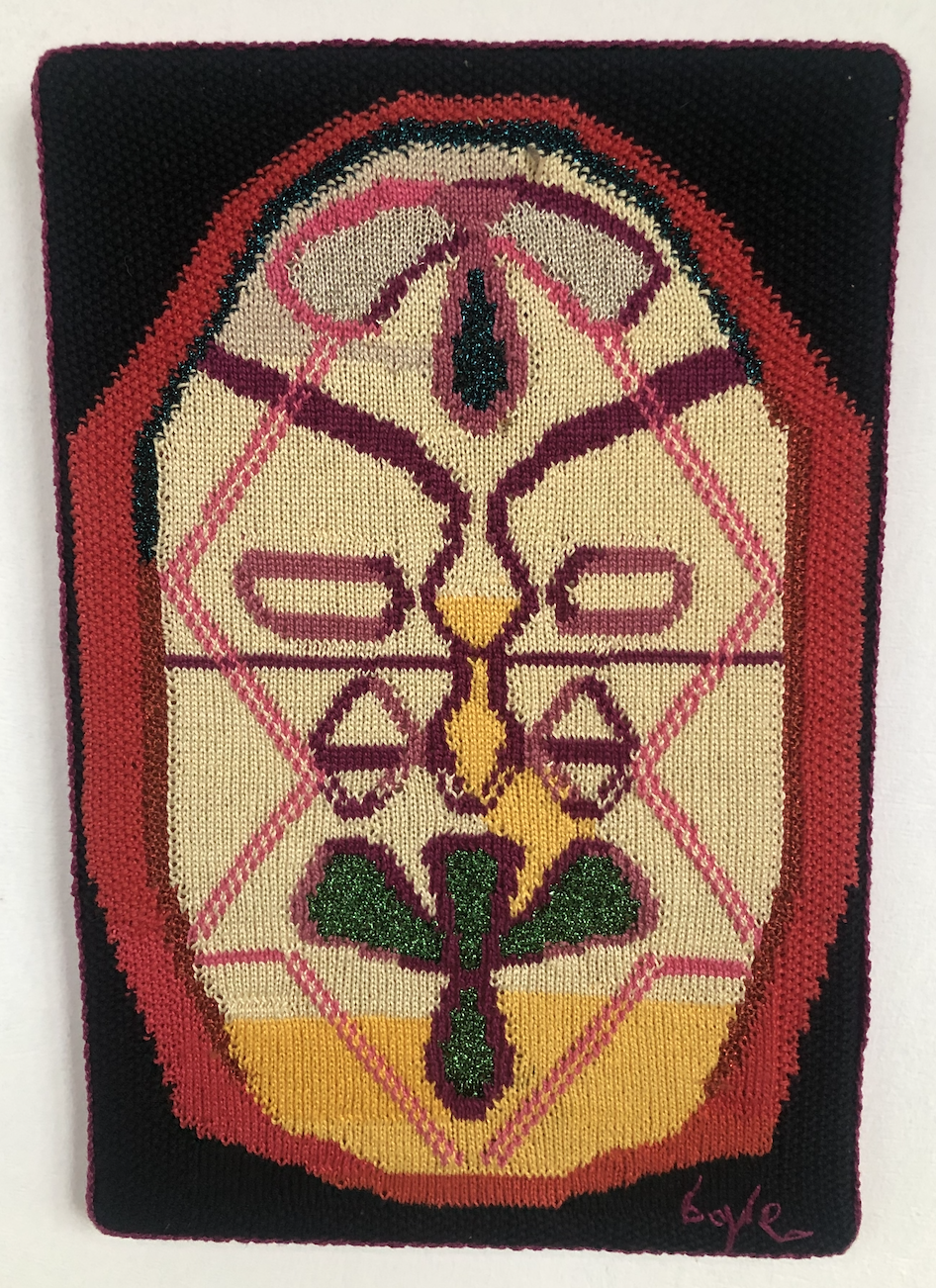 Vous venez de finir un rang… Vous passez alors votre tricot de la main droite à la main gauche en le retournant et vous continuez ainsi rang après rang. Le tricot grandit peu à peu et devient extensible à l’infini. Œuvre peuplée de symboles, de masques, de totems ou encore de signes qui sont des réminiscences mystérieuses, en perpétuelle gestation.